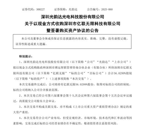 近日,光韵达发布《关于以现金方式收购深圳市亿联无限科技有限公司控制权暨签署购买资产协议的公告》,拟以3.52亿元的价格收购亿联无限56.0299%股权,一旦收购完成,光韵达将成为亿联无限控股股东,并将其纳入合并财务报表。